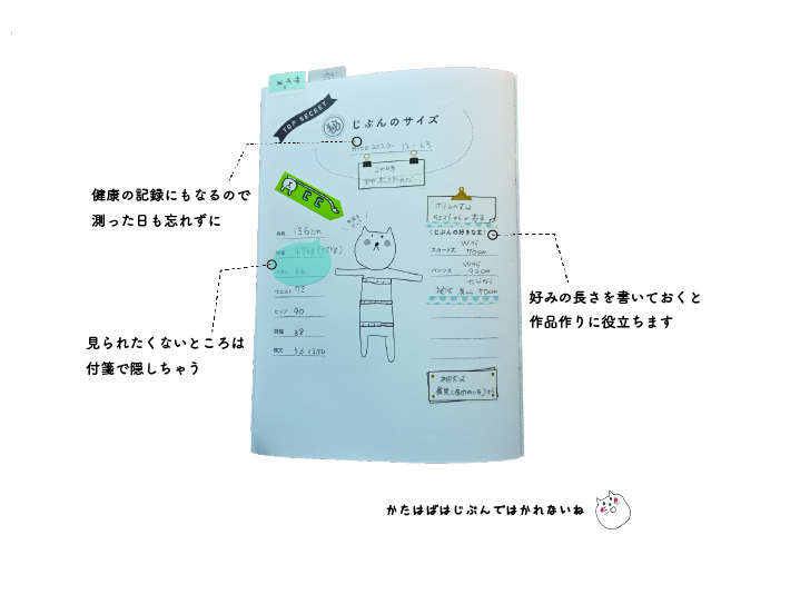 - 背表紙をめくると(P42)、猫ちゃんの身体にメジャーが巻いたイラストのページがあります。ここにご自分のサイズを書いてください。服作りをするときに自分のサイズを知ることはとても大切です。
